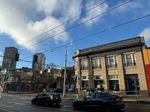 Features bright interior with skylights, exposed brick walls, fir wood floors, operable windows, ensuite restroom and kitchenette, and private entry fronting Broadway (no elevator).